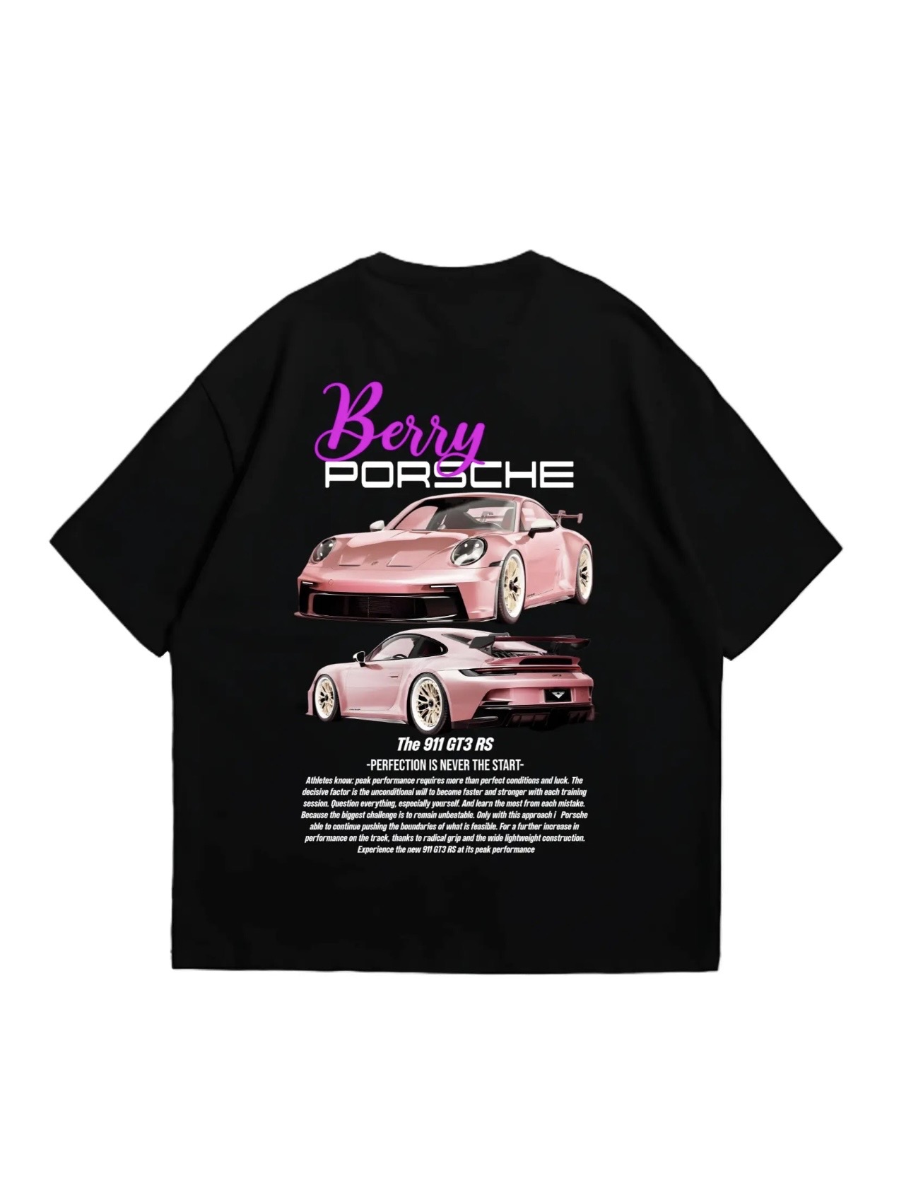 The Vibe “Perfection is never the start”—it’s a journey. This tee celebrates the legendary Porsche 911 GT3 RS, a car built for those who question everything and push the boundaries of what is feasible. With its striking pink “Berry” aesthetic against a deep black canvas, this design captures the grip, lightweight construction, and raw power of the track for your everyday wardrobe.