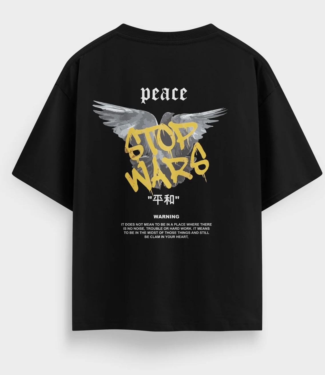 The Vibe Champion a global message of harmony with the Ethereal Peace Oversized Tee. This piece features a complex, multi-layered back graphic that combines classical symbolism with gritty, urban protest art. Set against a deep midnight black canvas, the juxtaposition of the soft, photographic dove and the aggressive yellow “street-tag” lettering creates a powerful visual tension. It is a definitive staple for those who view fashion as a medium for advocacy and social consciousness.