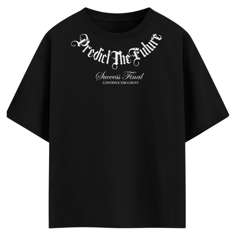 Gothic Calligraphy Print: Features the powerful phrase “Predict The Future” in a sweeping, ornate Old English font across the upper chest.