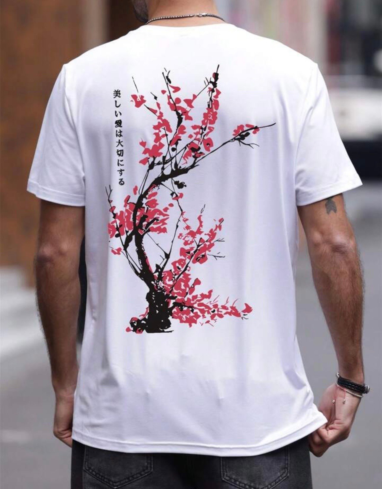 “Cyber-Botanical” Illustration: Features a massive back-print of traditional Sakura blossoms intertwined with glowing neon vines and “glitched” geometric shapes.