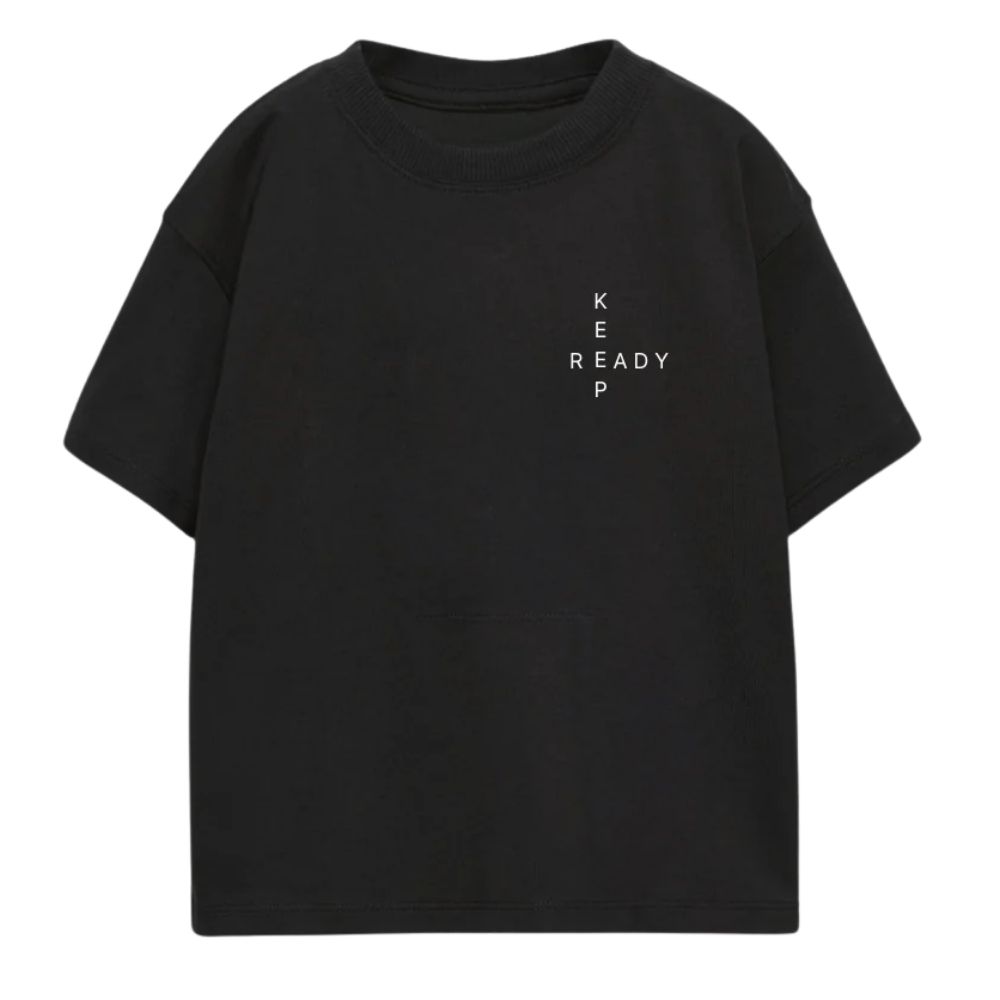 Stay sharp with the Keep Ready Oversized Tee. Featuring a unique cross-axis typographic graphic on the chest of a premium heavyweight black base, this tee offers a minimalist and tactical edge to any modern streetwear rotation.