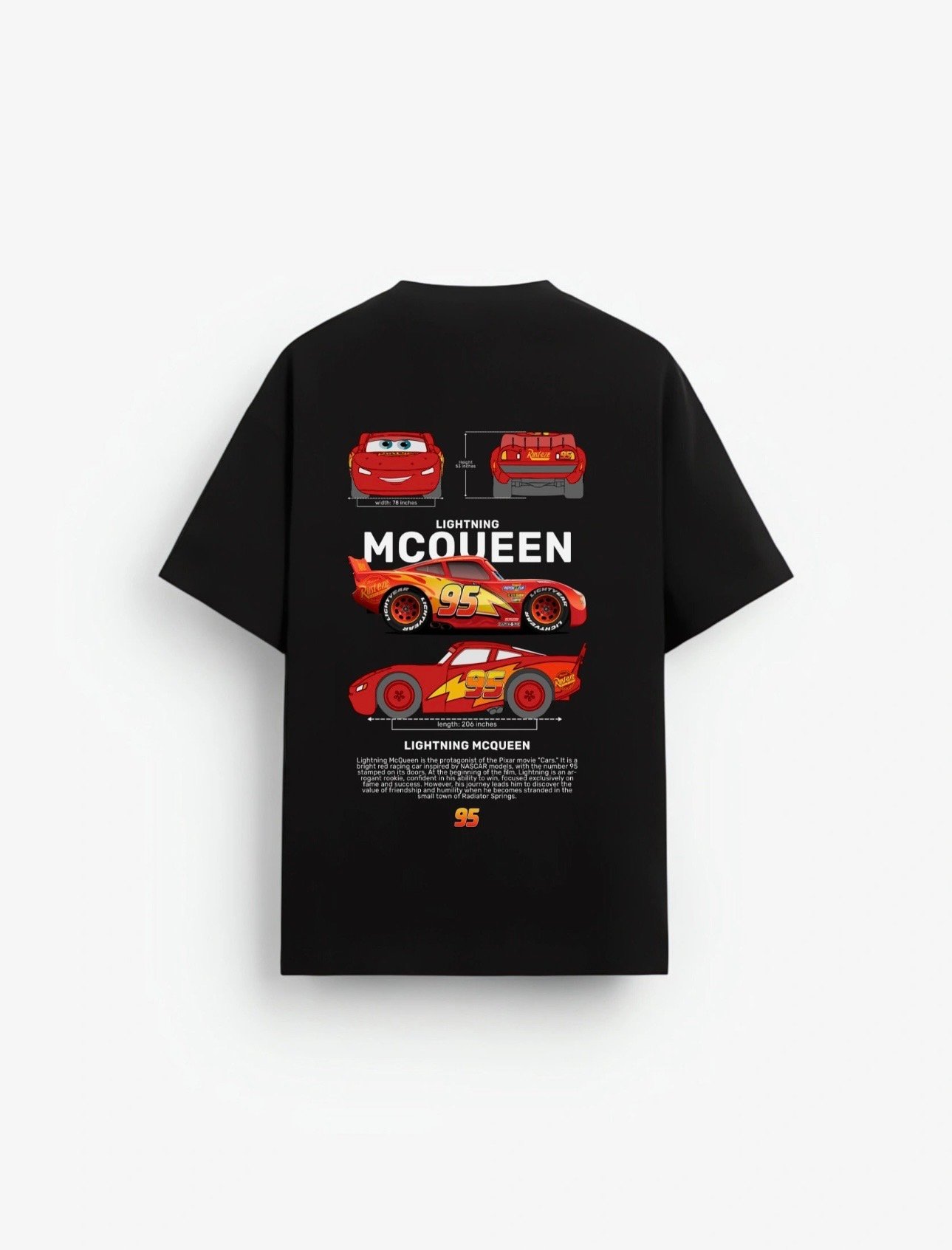 The Vibe Reignite the thrill of the Piston Cup with the Lightning McQueen “Speed & Spirit” Oversized Tee. This design captures the high-velocity transition of the legendary #95—from a cocky rookie to a seasoned champion with the heart of a racer. Set against a deep midnight black canvas, the technical back graphic features a “blueprint-style” silhouette of the iconic stock car, complete with his signature lightning bolt and “Rust-eze” heritage. It is a definitive staple for the generation that grew up on the “Ka-chow!” philosophy and respects the grit of Radiator Springs.
