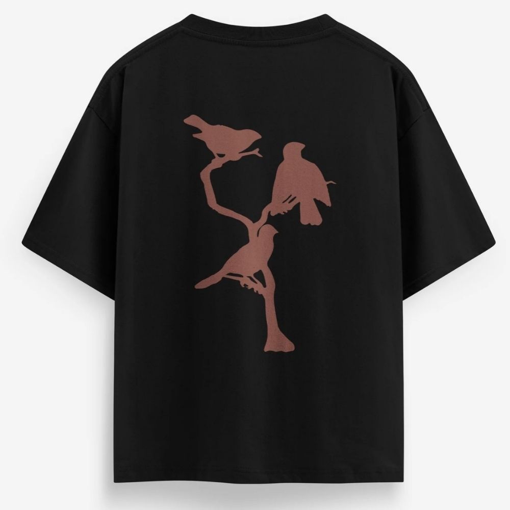 The Vibe Embrace a sense of quiet observation and natural mystery with the Midnight Avian Oversized Tee. This design features a large-scale back graphic of three birds perched on a gnarled branch, rendered in a muted, earthy clay-red. Set against a deep midnight black canvas, the silhouette-style art provides a sophisticated, nature-inspired aesthetic that feels both calm and commanding. It is the perfect piece for those who appreciate understated art and a relaxed, urban silhouette.