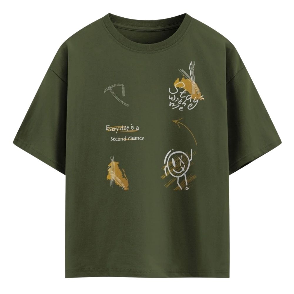 The Vibe Embrace a laid-back, optimistic aesthetic with the Second Chance Doodles Oversized Tee. This design features an olive green canvas adorned with an eclectic mix of hand-drawn sketches, motivational phrases, and abstract shapes in soft yellow and white. It’s a perfect piece for those who appreciate “organized chaos” and a DIY, artistic approach to everyday streetwear.
