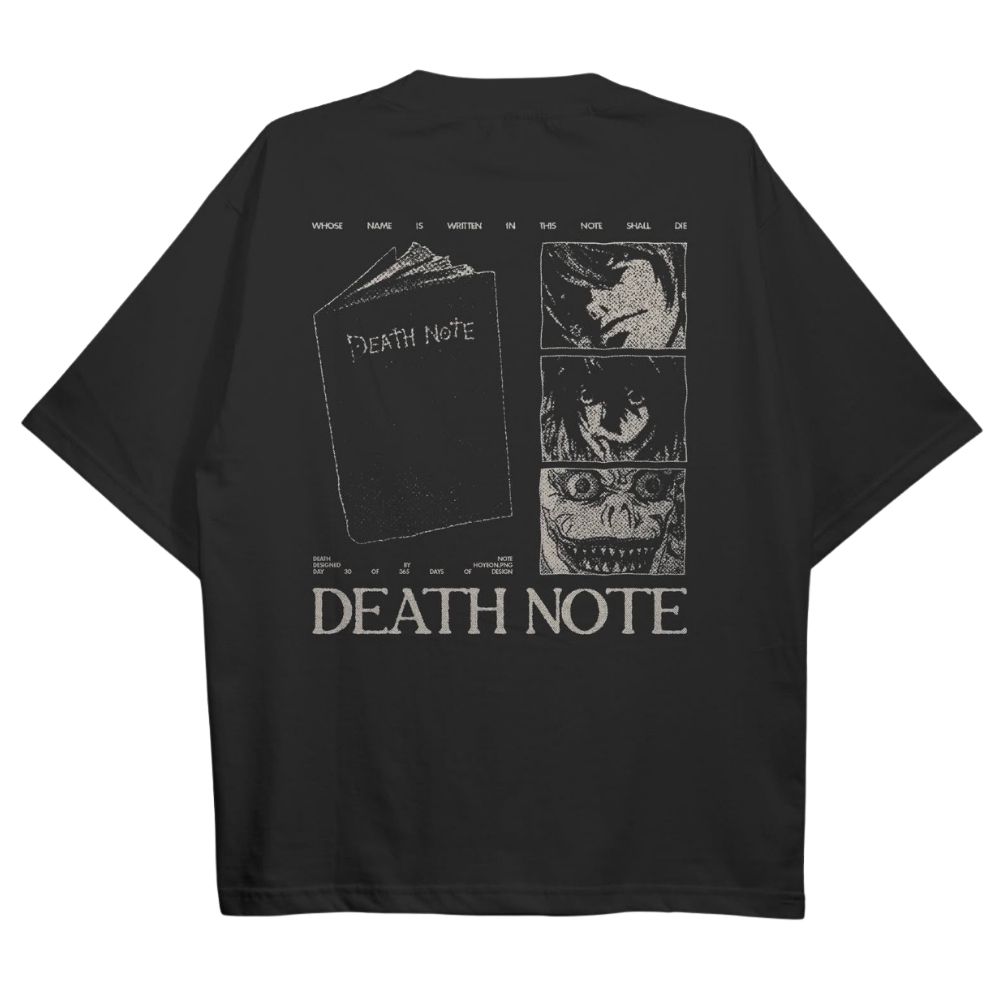 The Vibe Enter the world of high-stakes psychological warfare with the Shinigami’s Ledger Oversized Tee. This design is a tribute to the dark, intellectual intensity of the supernatural detective genre, featuring a large-scale back-print inspired by the ultimate tool of judgment. Set against a deep midnight black canvas, the gritty, high-contrast illustration brings a sense of mystery and suspense to your daily streetwear rotation.