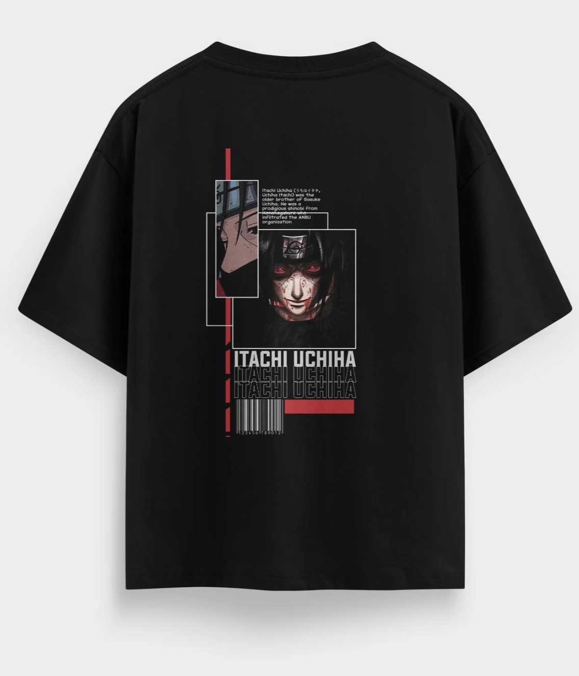 Dynamic Naruto Portraiture: Features a high-contrast back-print of Naruto in a battle-ready pose, rendered in a stylized, ink-splatter anime aesthetic.