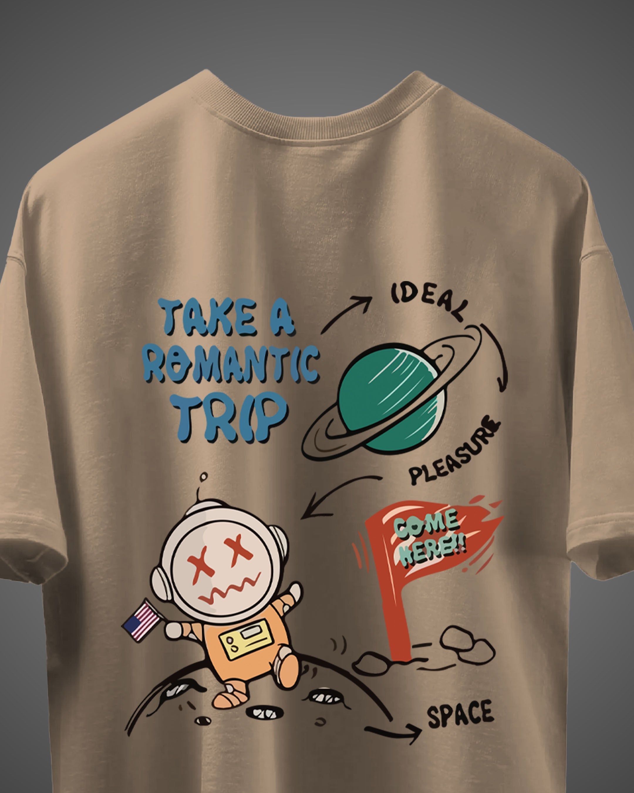 Playful Galactic Typography: Anchored by bubbly, blue “TAKE A ROMANTIC TRIP” lettering and a bold red “COME HERE!!” flag motif that adds a sense of urgency and invitation to the design.