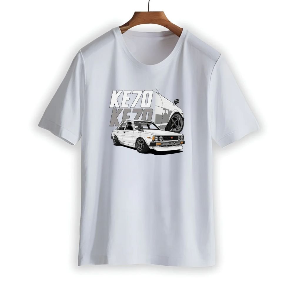 • “Box-Shape” Illustration: Features a high-contrast back-print of the KE70 sedan silhouette rendered in “Isometric-Vapor” vectors, highlighting the iconic quad-round headlights, fender mirrors, and deep-dish “Longchamp” style wheels.
