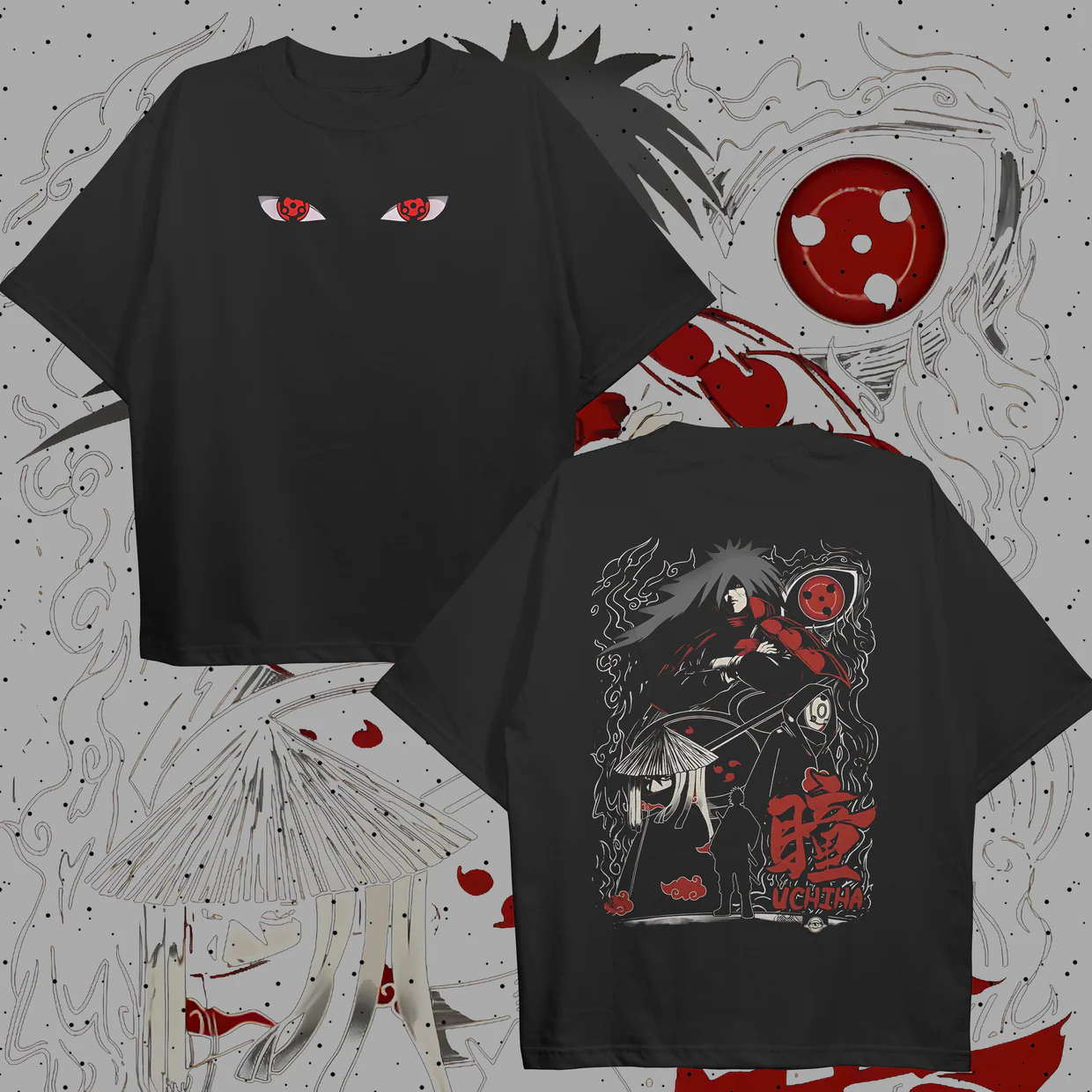 Cursed-Blood Palette: The graphic is electrified by “Uchiha Crimson,” “Void-Pupil Black,” and “Voltage White,” mimicking the intense, glowing heat of a fully activated dōjutsu.