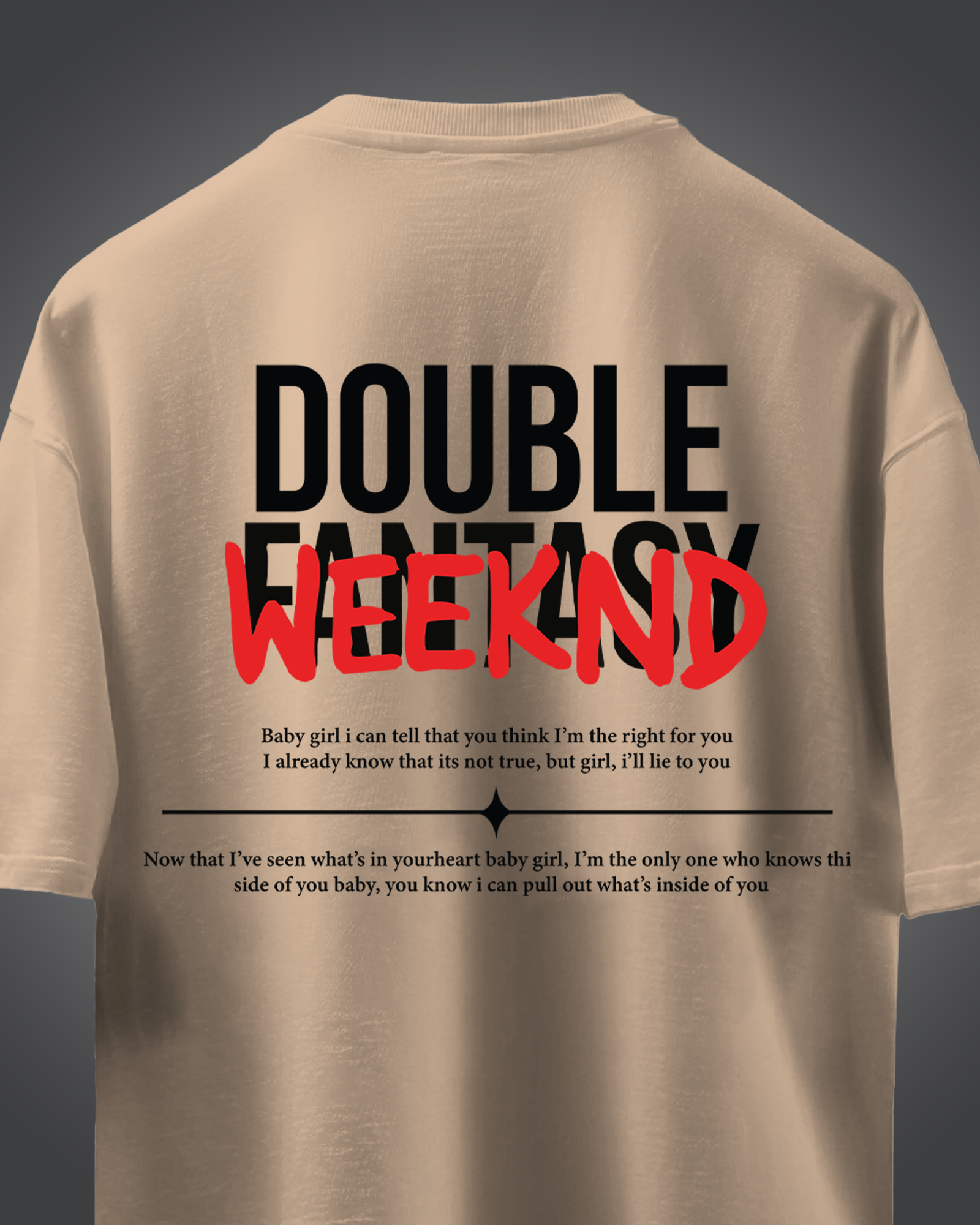 The Vibe Surrender to the dark allure of late-night R&B with the Icon-Series “Weekend” Oversized Tee, a tribute to the cinematic storytelling of modern pop royalty. This garment explores the theme of romantic disillusionment, featuring a high-impact typographic overlay on the back. The design is dominated by massive, black “DOUBLE FANTASY” block lettering, which is boldly interrupted by a vibrant crimson “WEEKND” tag in a raw, hand-painted script. Its architectural, boxy silhouette provides a heavy-weight, “After-Hours” drape that balances minimalist front aesthetics with a complex lyrical manifesto on the reverse. It is the definitive staple for the nocturnal dreamers, the music aficionados, and anyone who understands that the truth is often found between the lines of a song.