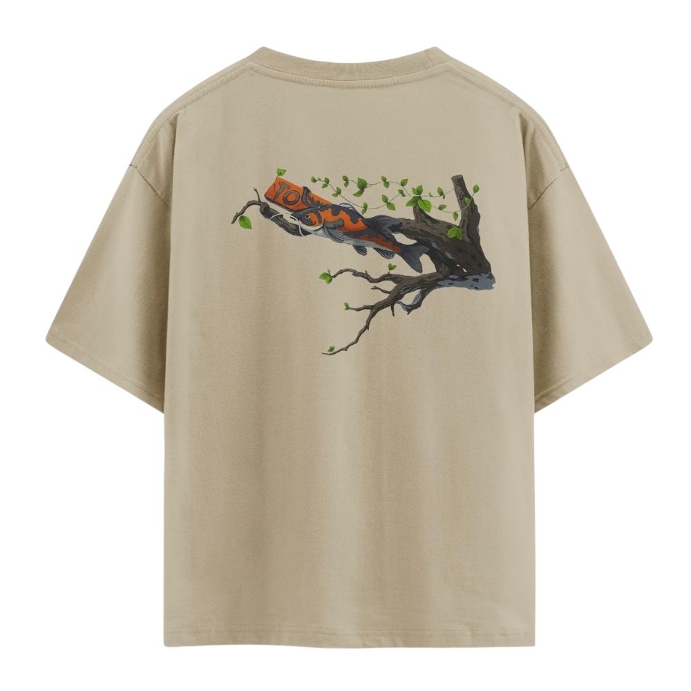 The Vibe Embrace a tranquil, artistic aesthetic with the Zen Koi Oversized Tee. This design features a beautifully detailed back-print of a Koi fish gracefully navigating a weathered tree branch adorned with delicate green leaves. Set against a sophisticated sand-beige canvas, the artwork balances the movement of the fish with the stillness of nature, creating a peaceful yet high-impact piece for the modern minimalist. It is an essential choice for those who appreciate Eastern-inspired art and a relaxed, earth-toned silhouette.